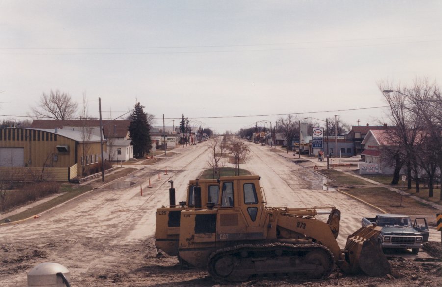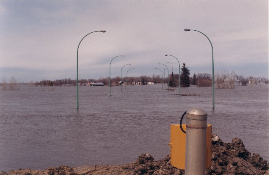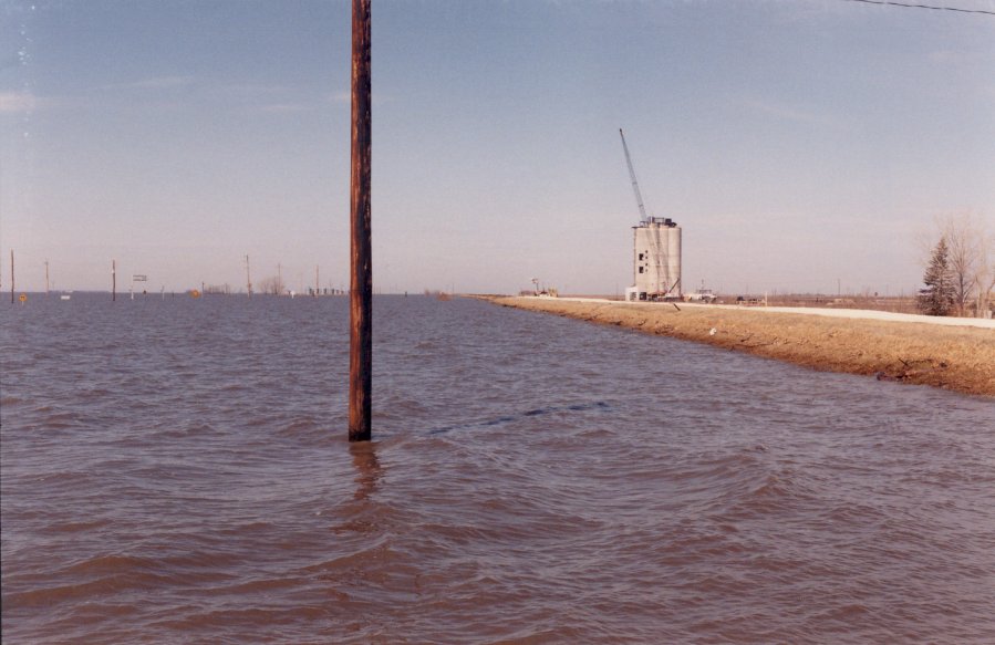 This is the southern part of the ring dike showing the new Paterson elevator that is still under construction. On top of this elevator is the VE4CDN repeater which was moved here from St. Jean one week before the dike was closed and the town of Morris evacuated of all but essential personell. The repeater had some overheating problems at the new site and was little used by the ARES operation. If it hadn't been moved though it would have been severly damaged by water. 10th day of operation.