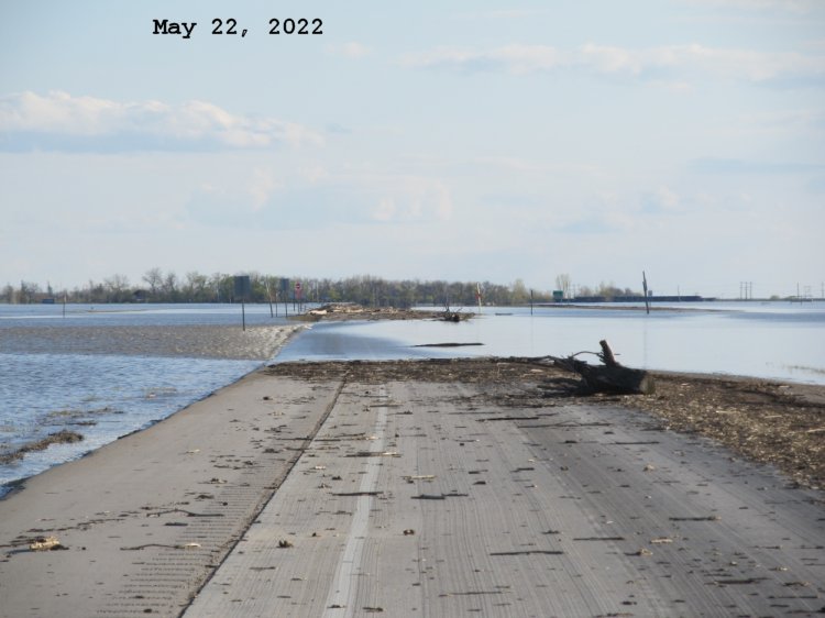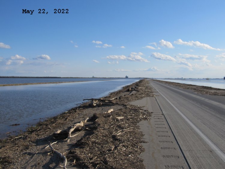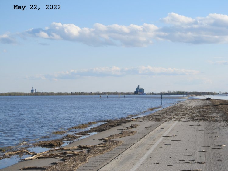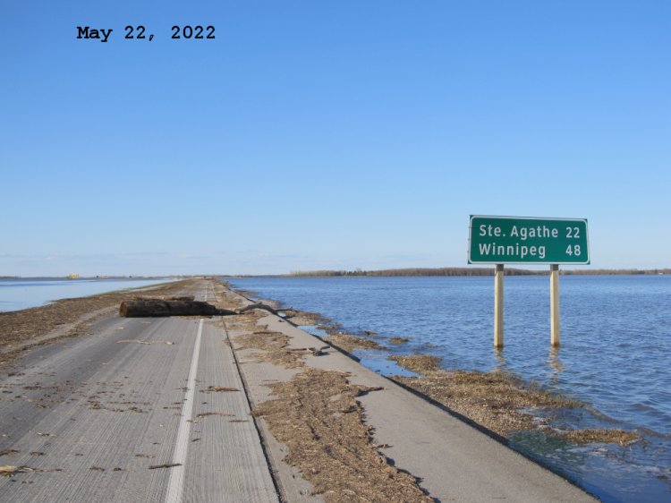 Looking south along the northbound lanes of Hwy 75 north of Road 26N (330 junction). Strong current still flowing west to east over the lanes here.