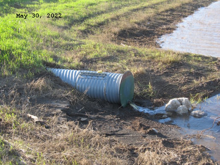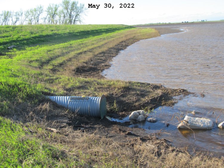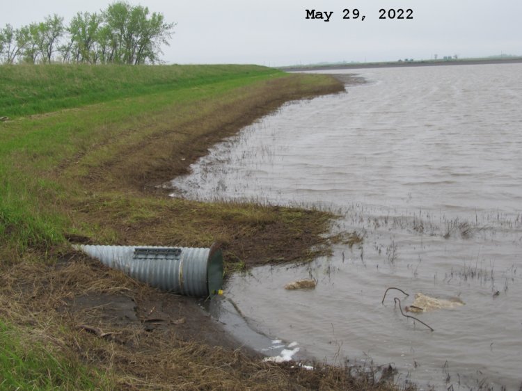 Looking north along our dike at the culvert outlet. Close to being above water again.